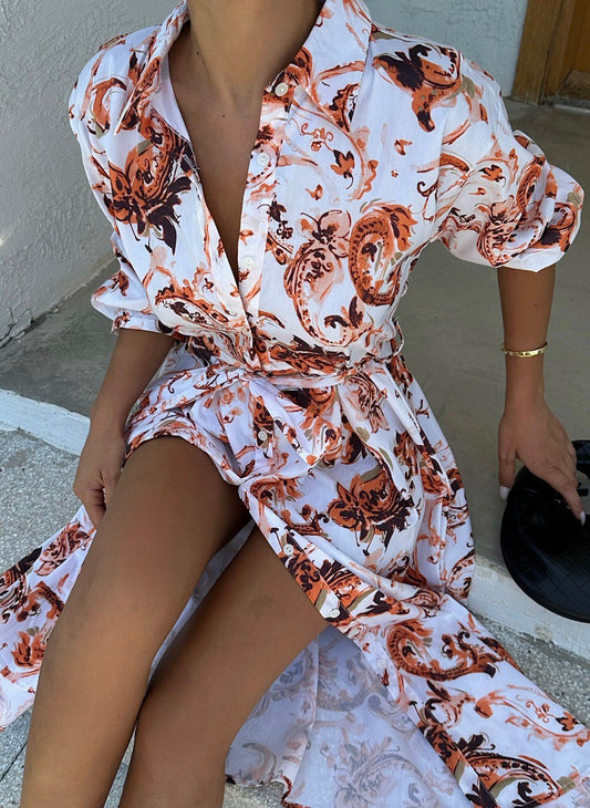 Λευκό Φόρεμα με Καφέ Floral Μοτίβο και Ζώνη στη Μέση | κωδ. DR35402