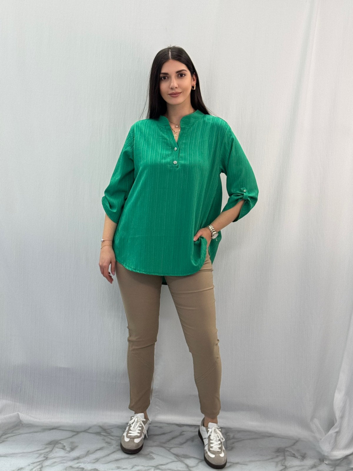 Ανανεώστε τη συλλογή σας με αυτή την κομψή πράσινη μπλούζα με κουμπάκια και γιακά mao. Διαθέτει 3/4 μανίκια με κουμπί, ιδανική για καθημερινή χρήση αλλά και για πιο επίσημες εμφανίσεις.