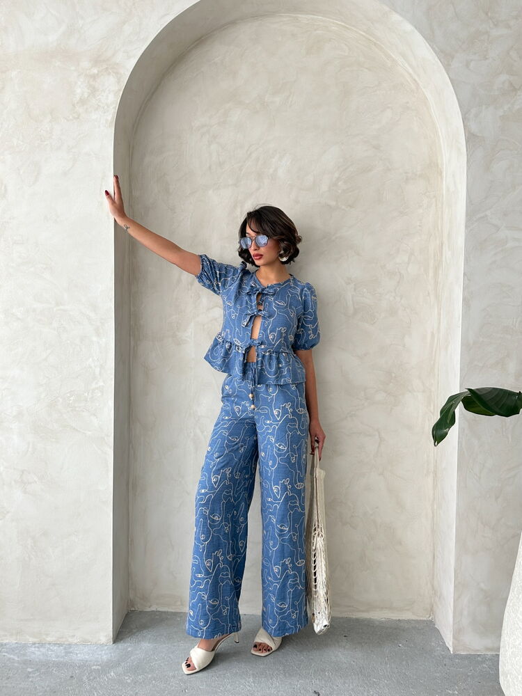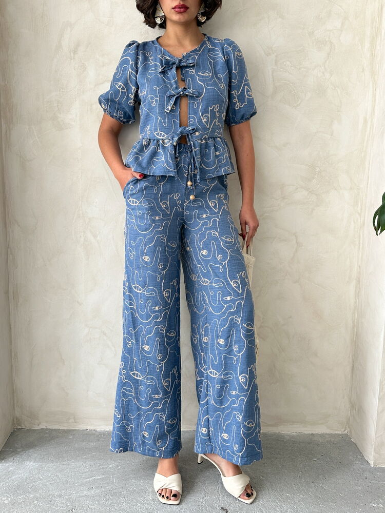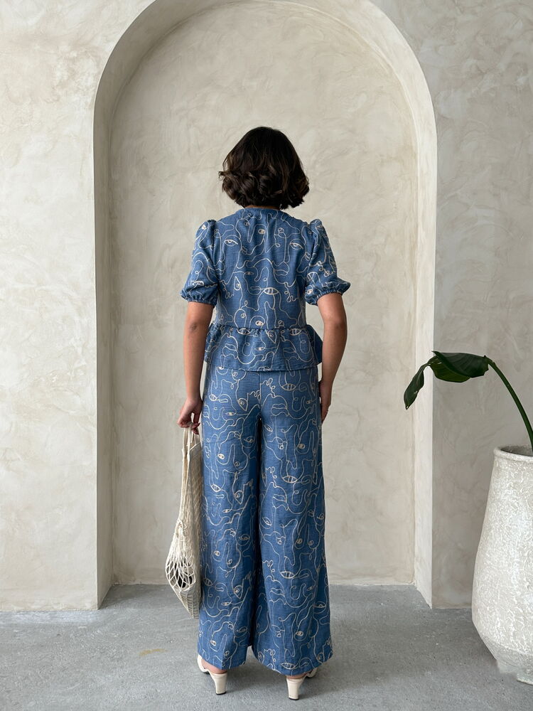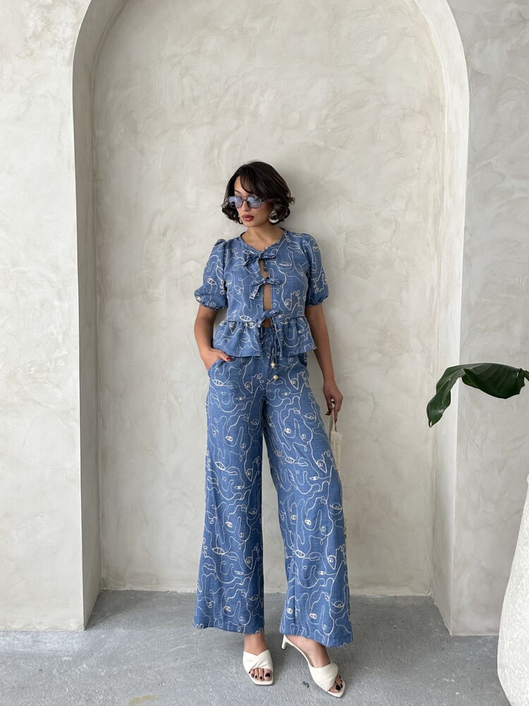 Λινό παντελόνι σε φαρδιά γραμμή, διακοσμημένο με ιδιαίτερο κέντημα που δίνει boho χαρακτήρα. Συνδυάζεται εύκολα με απλά τοπ ή με την αντίστοιχη μπλούζα για ολοκληρωμένο outfit. Ελαφρύ και ευκολοφόρετο, τέλειο για καθημερινές εμφανίσεις.