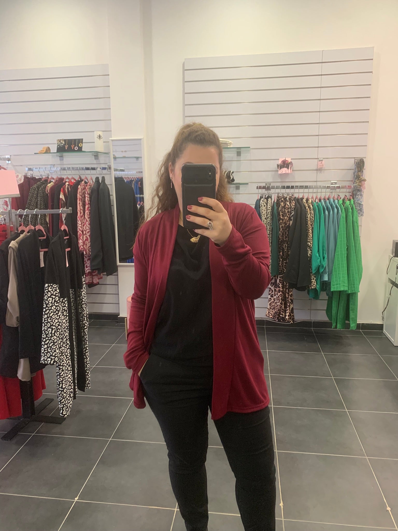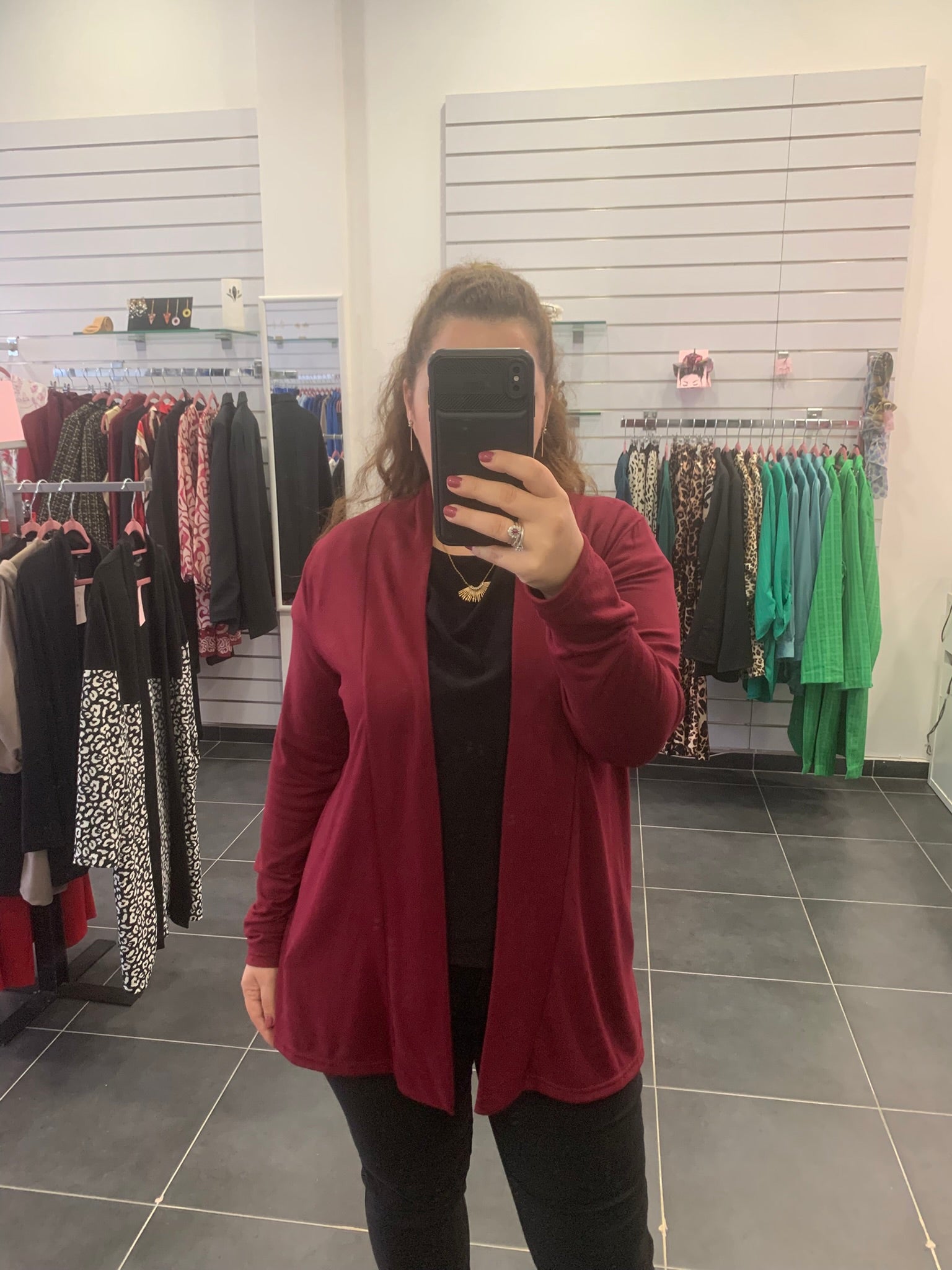 Γυναικεία μπορντό ζακέτα ελληνικής βιοτεχνίας σε μοντέρνα γραμμή. Είναι one size και καλύπτει άνετα έως XL με περιφέρεια στήθους έως 110 εκ.. Το ύφασμα αποτελείται από 80% βισκόζη, 15% πολυέστερ και 5% ελαστικό, προσφέροντας απαλή υφή, άνεση και διακριτική ελαστικότητα για καθημερινή χρήση. Ιδανική επιλογή για casual και office looks, συνδυάζεται εύκολα με παντελόνια ή φορέματα.