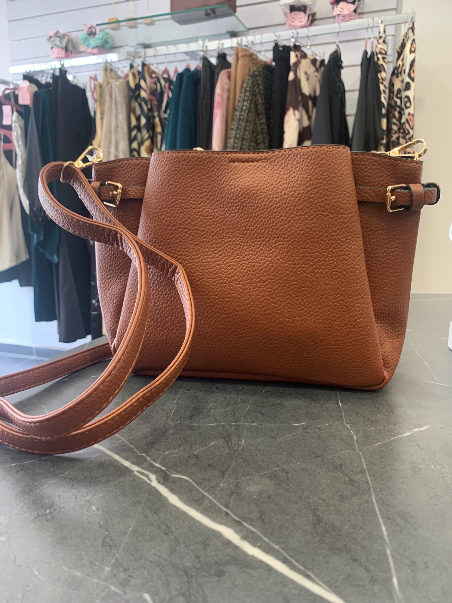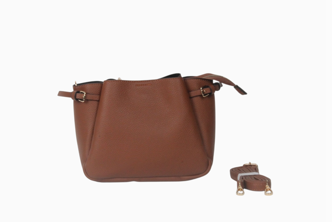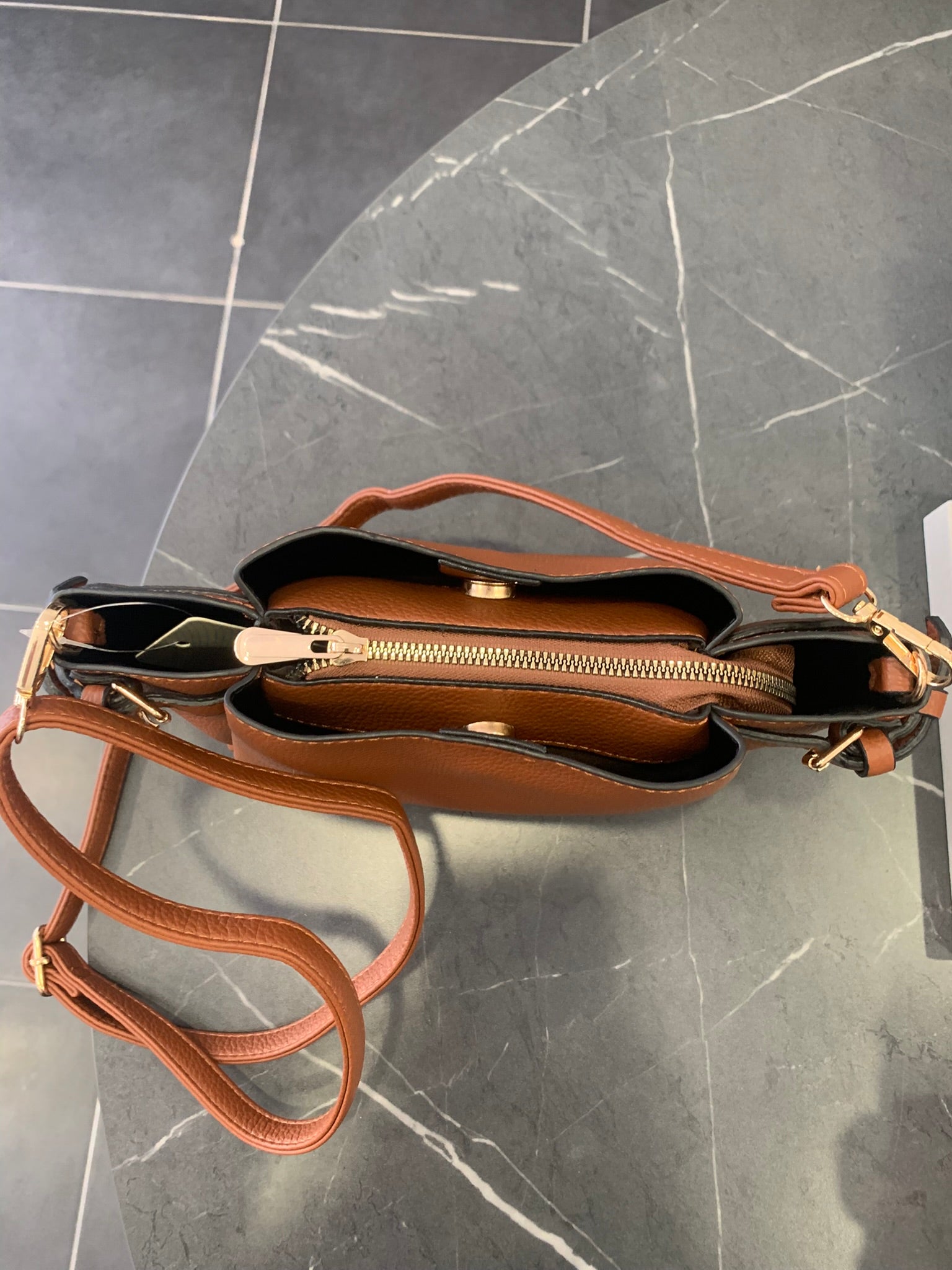 Τσάντα χιαστί σε καφέ απόχρωση με δερμάτινη υφή. Διαθέτει πρακτικό λουράκι για άνετη εφαρμογή στον ώμο ή χιαστί και επαρκή χώρο για τα καθημερινά σας αντικείμενα. Με διαστάσεις 27x19x10 εκ., αποτελεί ιδανική επιλογή για καθημερινή χρήση, συνδυάζοντας λειτουργικότητα και στυλ.
