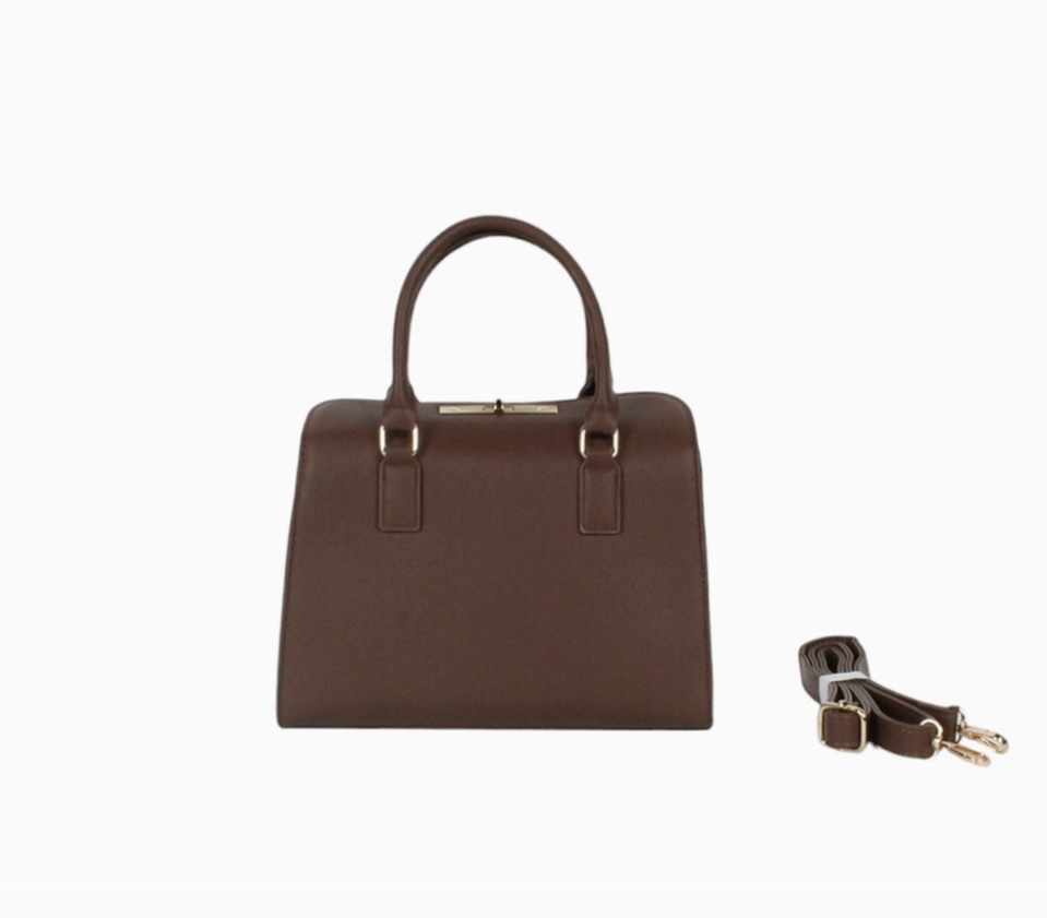 Γυναικεία τσάντα χειρός από δερματίνη, σε κομψή και στητή γραμμή. Διαθέτει αποσπώμενο λουράκι για να φοριέται και στον ώμο, ενώ το χρυσό κούμπωμα προσθέτει διακριτική πολυτέλεια στο σχέδιο. Με διαστάσεις 10.5 x 26 x 20 εκ., προσφέρει πρακτικότητα και στυλ, αποτελώντας ιδανική επιλογή για καθημερινές και πιο επίσημες εμφανίσεις.