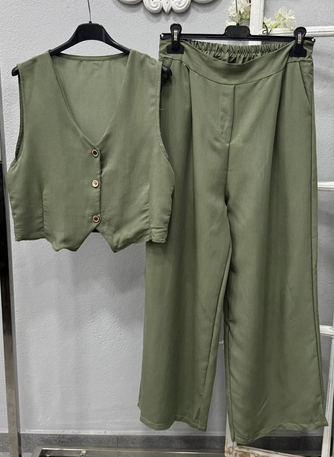 Αέρινο χακί σετ με γιλέκο και παντελόνα, ιδανικό για καθημερινές αλλά και πιο προσεγμένες εμφανίσεις. Με μαλακή υφή και άνετη εφαρμογή, χάρη στο μείγμα viscose και polyester, προσφέρει κομψότητα χωρίς συμβιβασμούς στην άνεση. Συνδυάζεται εύκολα με σανδάλια ή sneakers.
