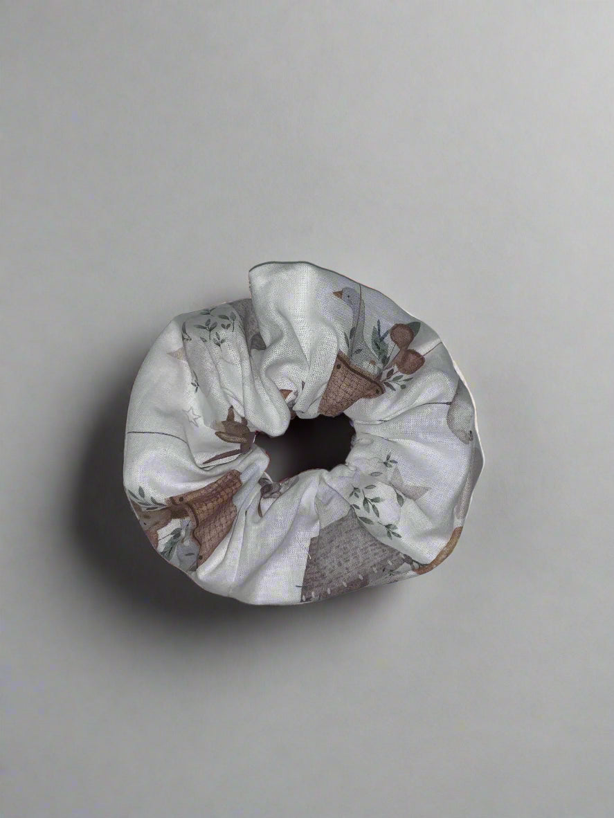 Λευκό handmade βαμβακερό scrunchie με χαρούμενα παιδικά σχέδια που απεικονίζουν λαγουδάκια και αρκουδάκια. Κατασκευασμένο από 100% βαμβάκι, είναι απαλό με τα μαλλιά και δεν ταλαιπωρεί την τρίχα. Εφαρμόζει άνετα σε κοτσίδες και αλογοουρές, προσφέροντας σταθερό κράτημα χωρίς να τραβάει. Ιδανικό για καθημερινή χρήση, συνδυάζει πρακτικότητα με παιχνιδιάρικη αισθητική.