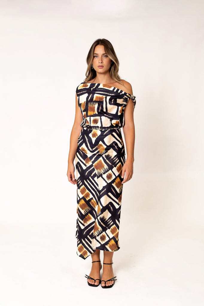 Εντυπωσιακή φούστα με εμπρός σκίσιμο που δίνει δυναμισμό και κομψότητα σε κάθε look. Το ιδιαίτερο γεωμετρικό μοτίβο συνδυάζεται με την κολακευτική γραμμή και το ρευστό ύφασμα, δημιουργώντας μια fashionable επιλογή για all-day εμφανίσεις.